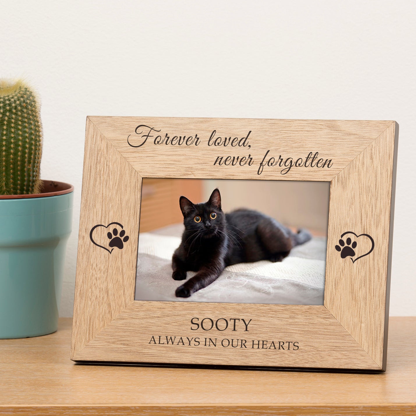 Keep the memory of a beloved pet close with this beautifully engraved “Always in Our Hearts” wooden picture frame.. A meaningful tribute to a dog, cat, or other cherished companion, this frame offers a comforting way to honour the love and joy your pet brought into your life.
