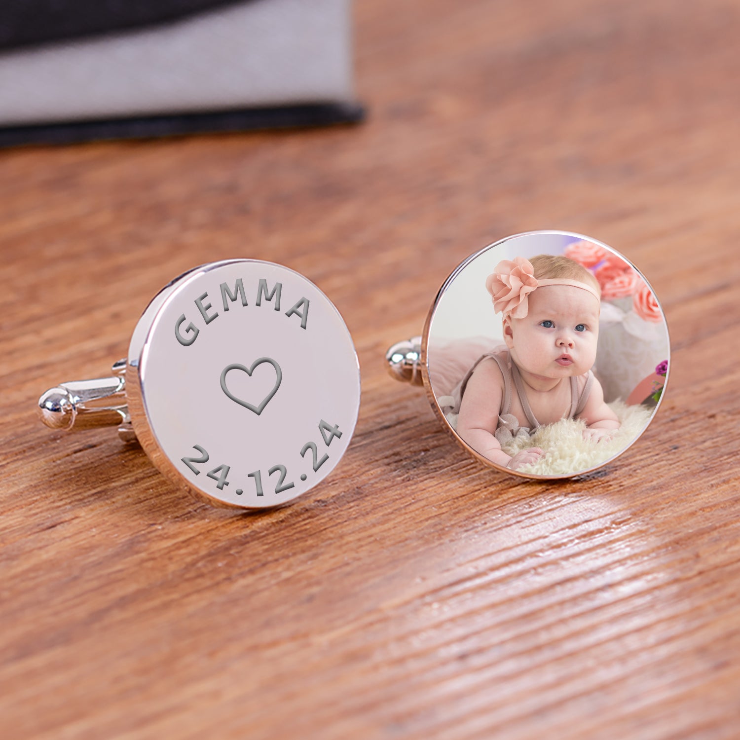 Childs Name & Date Photo Upload Cufflinks - Silver Finish