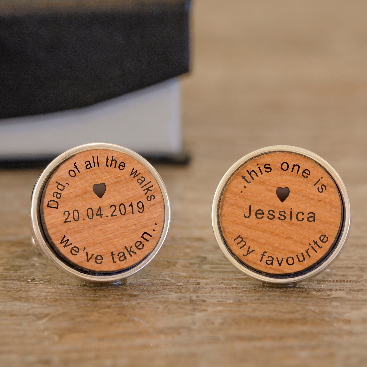 High quality silver finish round cufflinks with a cherry wood centre. The first cufflink is engraved ""Dad, of all the walks we've taken.."" along with a date of your choice. The second cufflink is engraved ""..this one is my favourite"" along with a name of your choice. Supplied in a smart cufflink case.