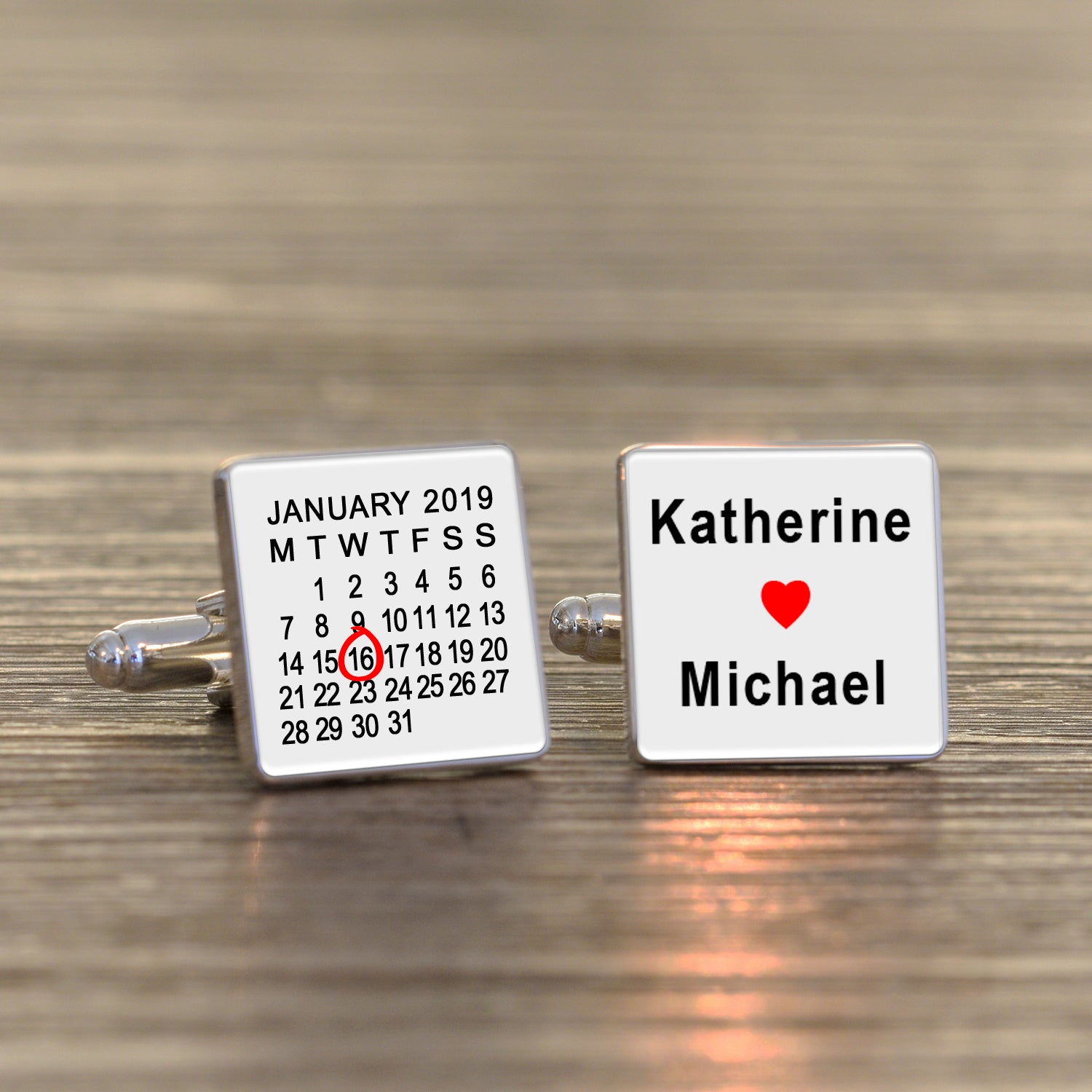 High quality square silver finish cufflinks. Personalise with a special date and two names. (The red heart symbol is fixed). Available in Black or White. Supplied in a smart cufflink case.