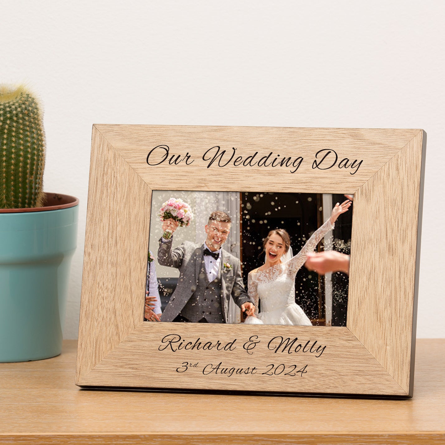 A stylish personalised oak finish photoframe. The top of the frame is engraved with "Our Wedding Day". The bottom of the frame is engraved with two names and a date. The frame holds either a 6 x 4 photograph (Outer dimensions are 220mm x 170mm) or a 7 x 5 photograph (Outer dimensions are 245mm x 195mm). Available Landscape only.