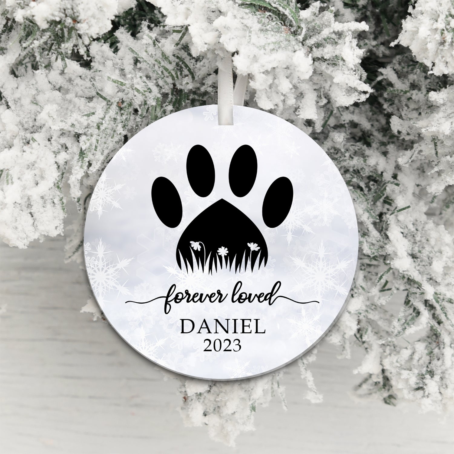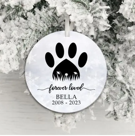 Honour the memory of your beloved pet with this elegant Forever Loved ornament. Featuring a bold black paw print and delicate floral details, this keepsake is printed with your pet’s name and years of life to create a timeless tribute.