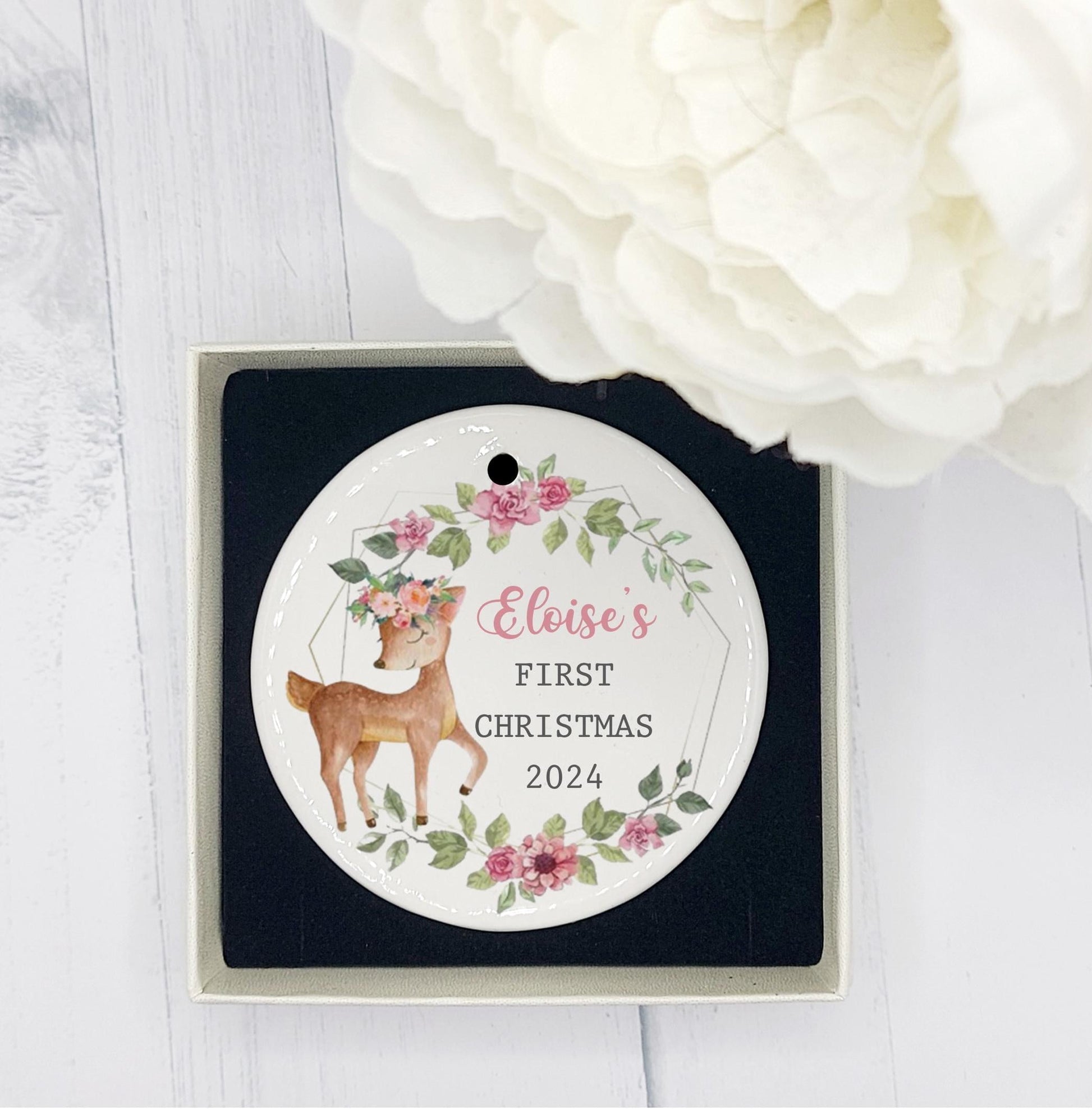The design features a stunning water colour wreath with deer character and the words (Name's) First Christmas 2024.