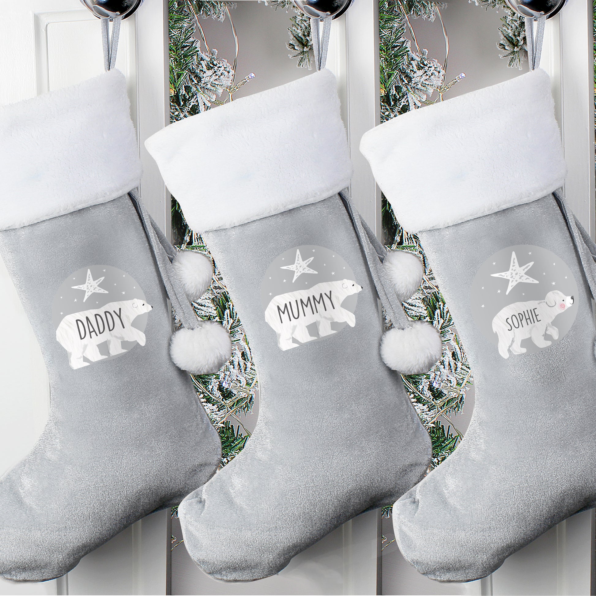 Personalised Baby Polar Bear Luxury Silver Grey Stocking