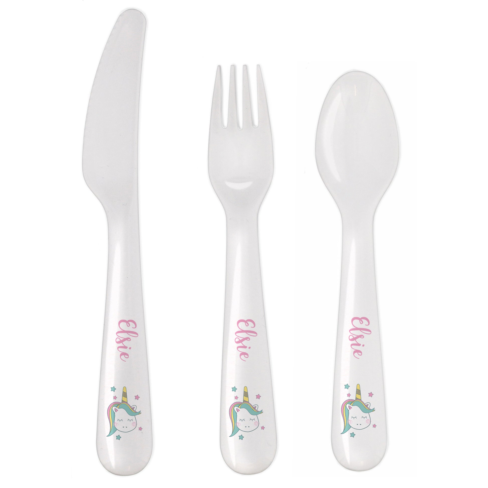 This practical 3 piece set of plastic cutlery featuring a cute baby unicorn design can be personalised with any name up to 12 characters in length.