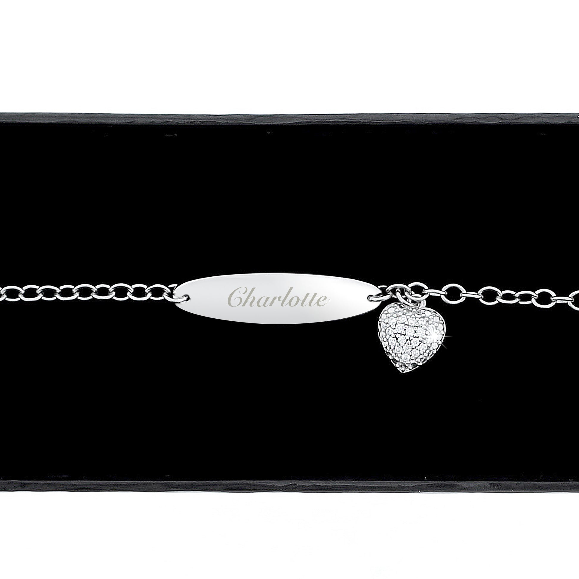 The bracelet is made from sterling silver and features 10 round cubic zirconia, inserted into the heart tag.