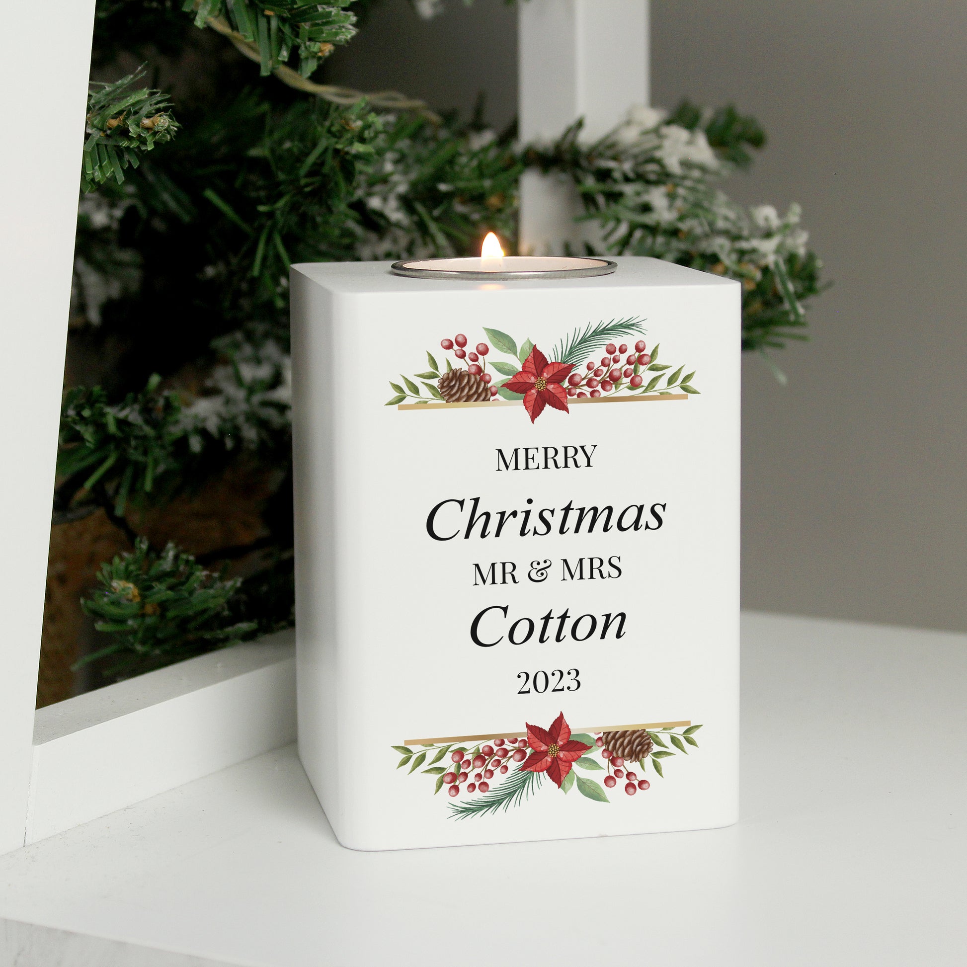 Personalise this white wooden tea light holder with up to 5 lines of text, each line has up to 25 characters available.