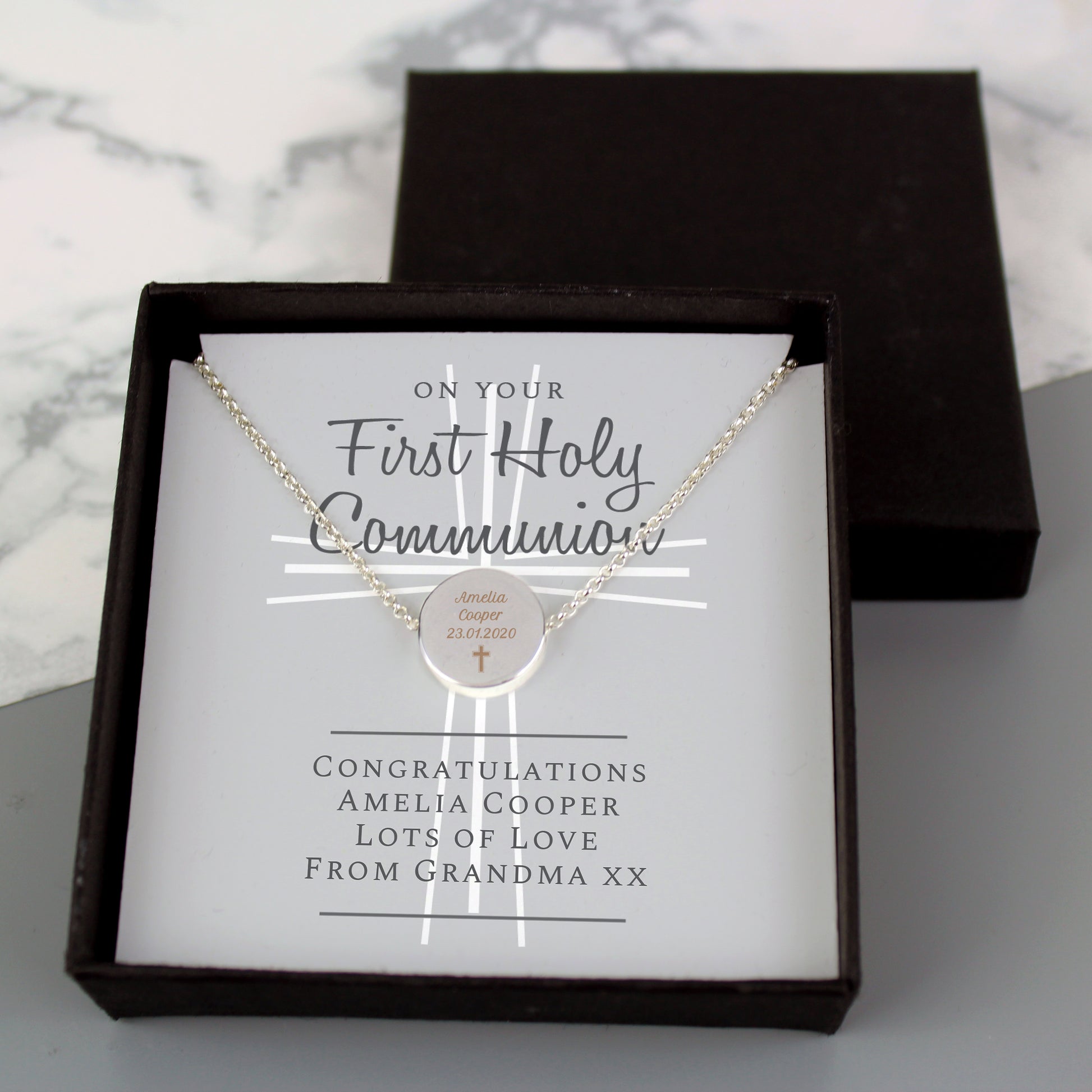 This Personalised Initials Disc Necklace and sentiments card is a stylish and elegant gift for a 1st Holy Communion.
