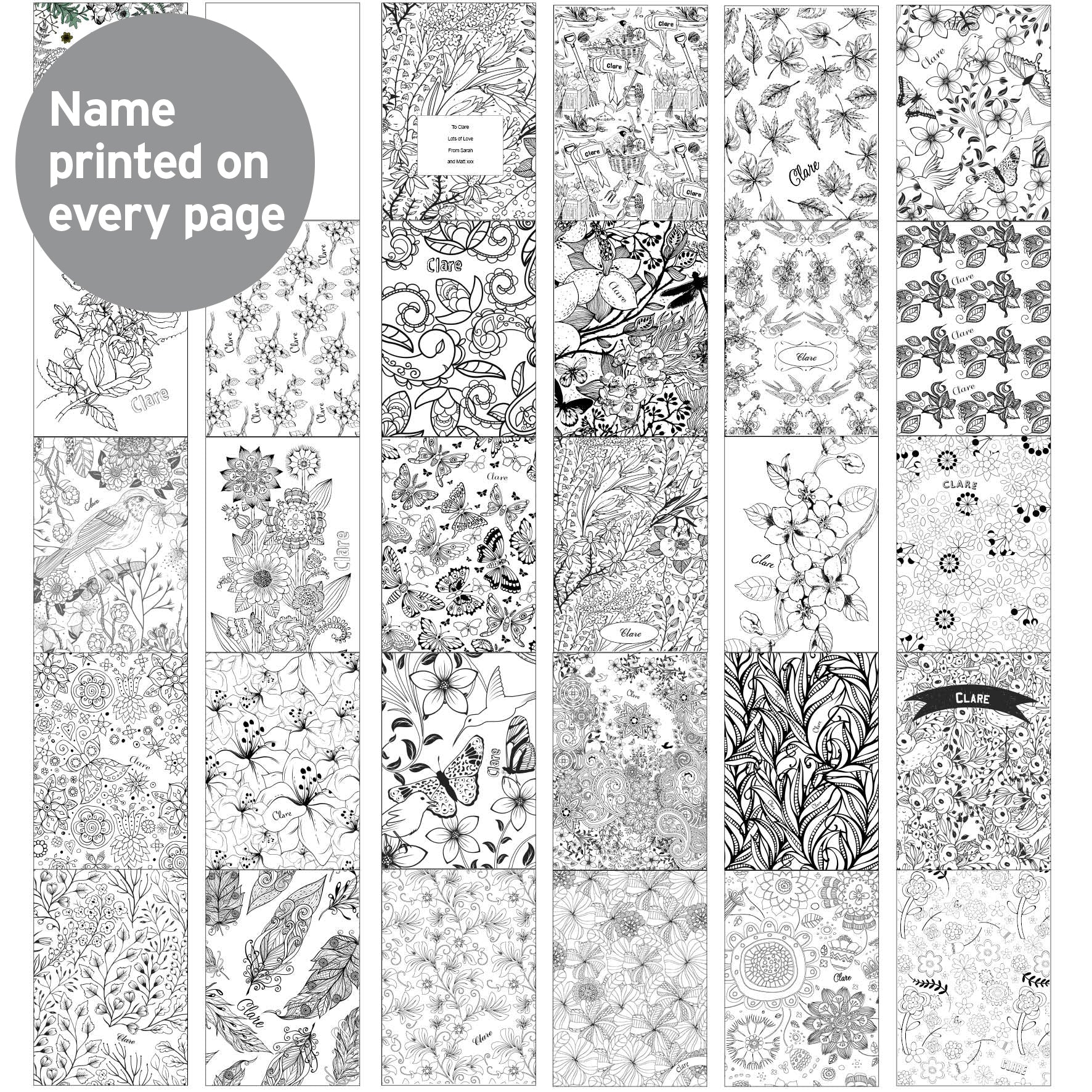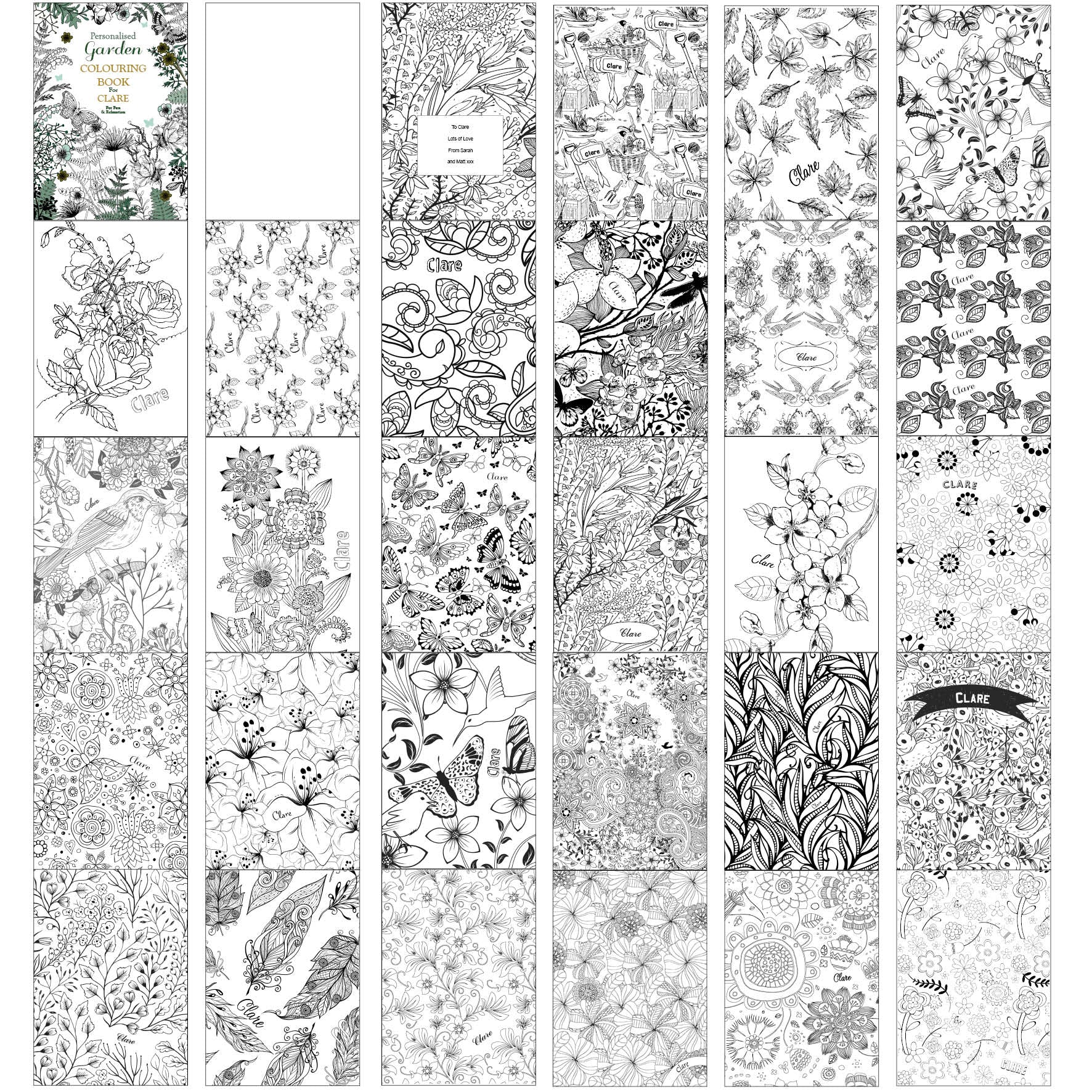 This Garden Colouring Book can be personalised with a name (this will also appear throughout the book, on each page). You can then add a message over 4 lines of up to 20 characters per line (this will appear on the inside page).