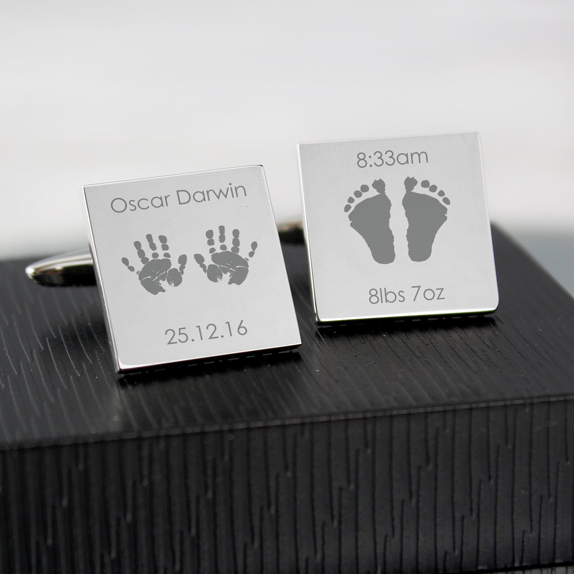 The cufflinks can be personalised with up to 4 lines, 15 characters per line. Lines 1 and 2 can feature the name and date of the new baby and will appear on cufflink 1. Lines 3 and 4 can feature the time and weight of the new baby and will appear on cufflink 2.