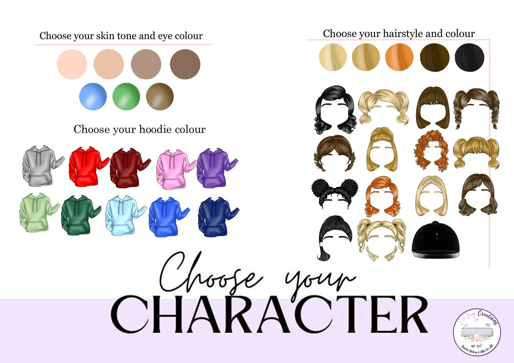 Features a custom character with choice of hair, skin colour, hoodie colour then you can choose whether they are wearing a riding hat or not. You can even customise the choice of horse colour!