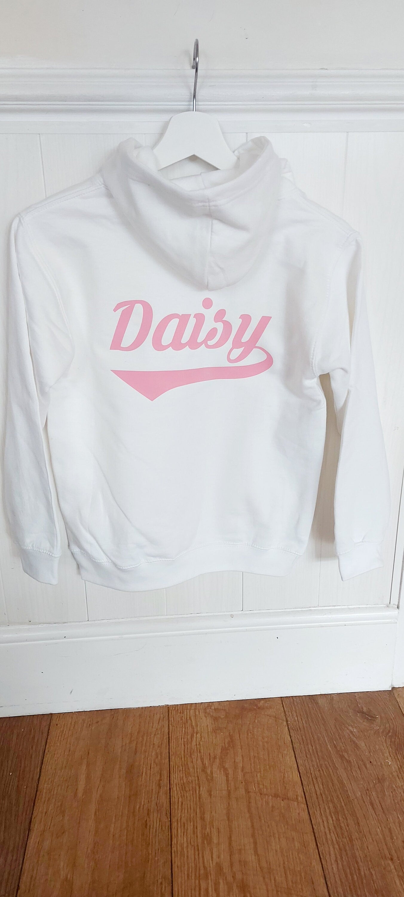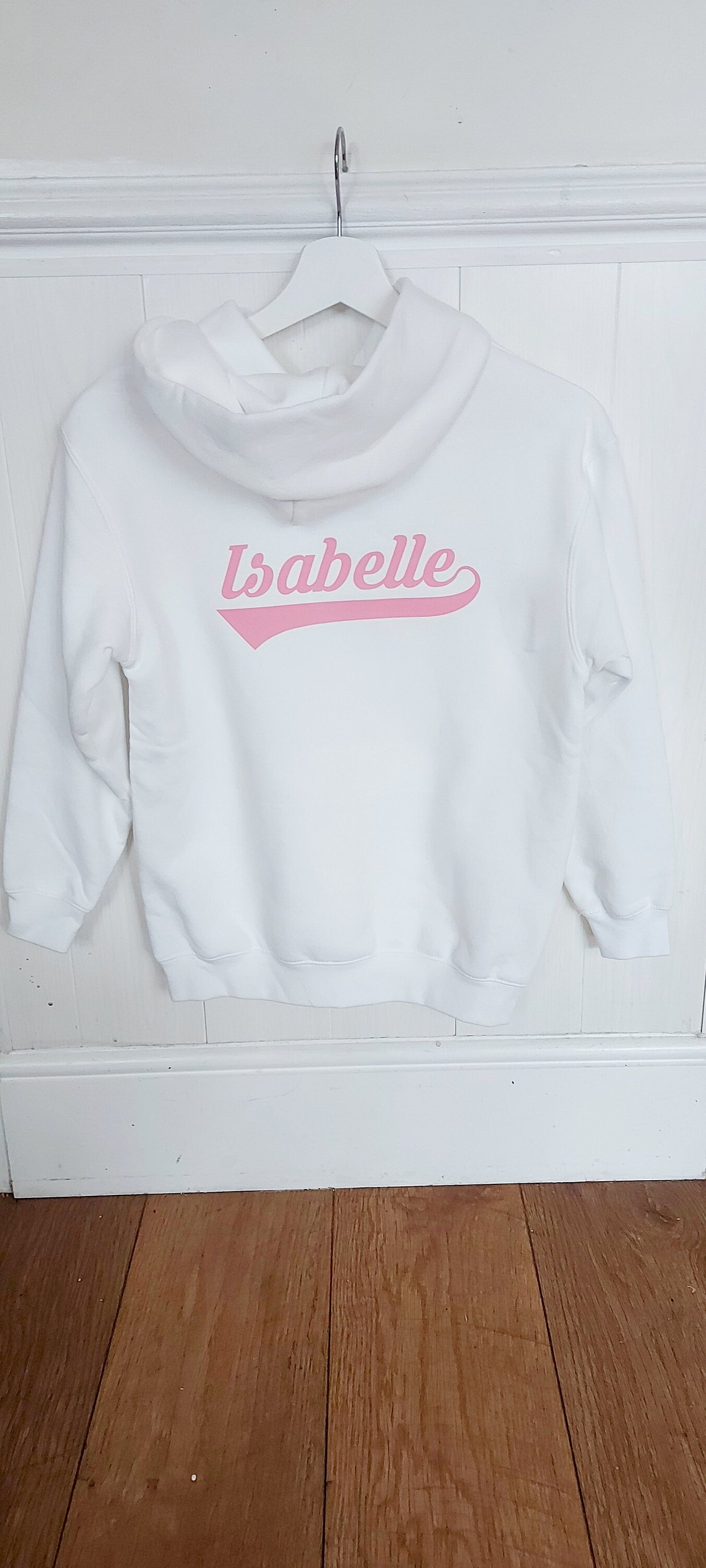 This is a white hoodie which has glittery silver, black and baby pink print with a choice of personalisation colour (if required) Please note that if you choose purple for the name, it will NOT be in glitter print. You can also now choose whether you would like the name on the sleeve or back of hoodie - simply make your selection from the drop down box then add the name in the personalisation box.