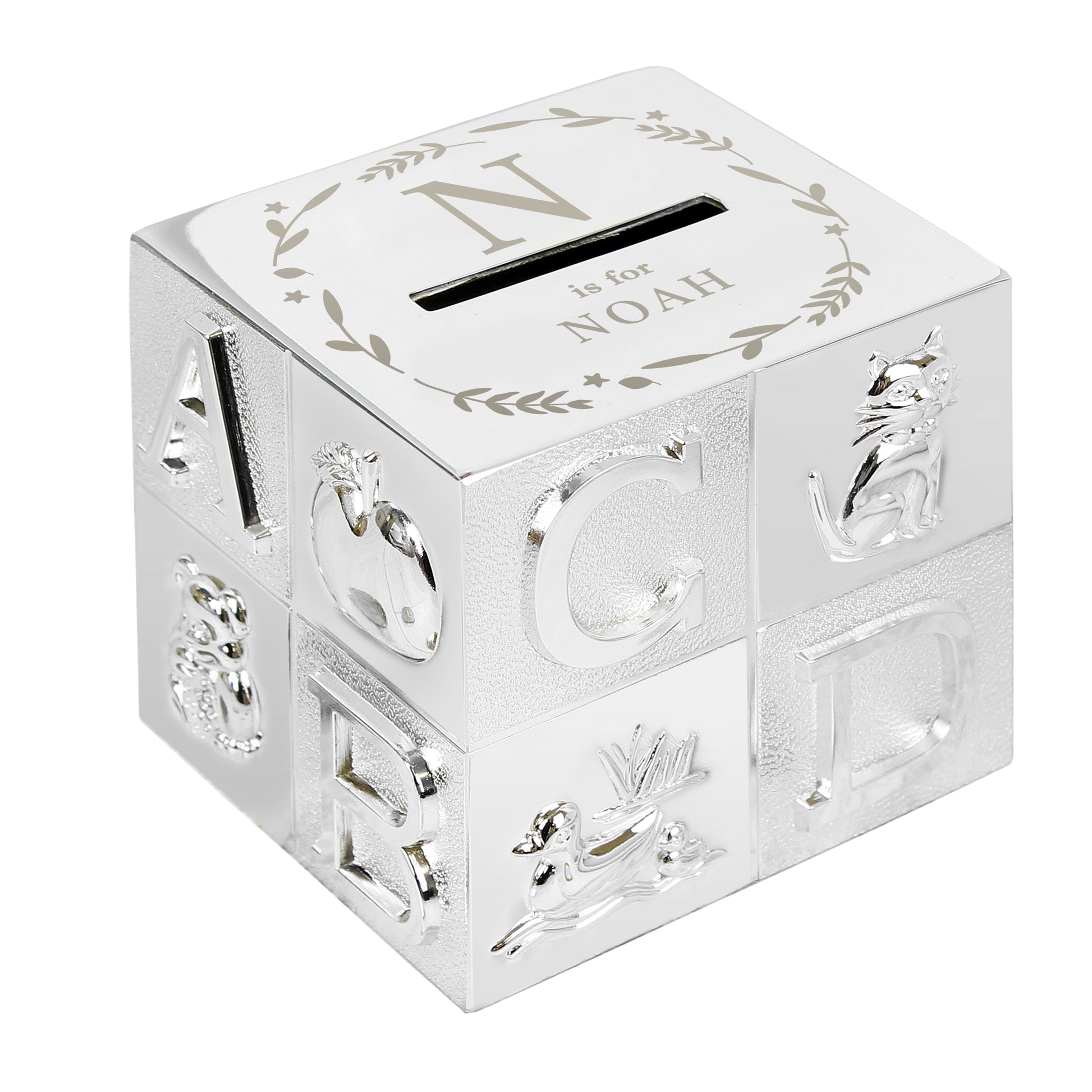 The money box can be personalised with an initial and a name up to 12 characters.