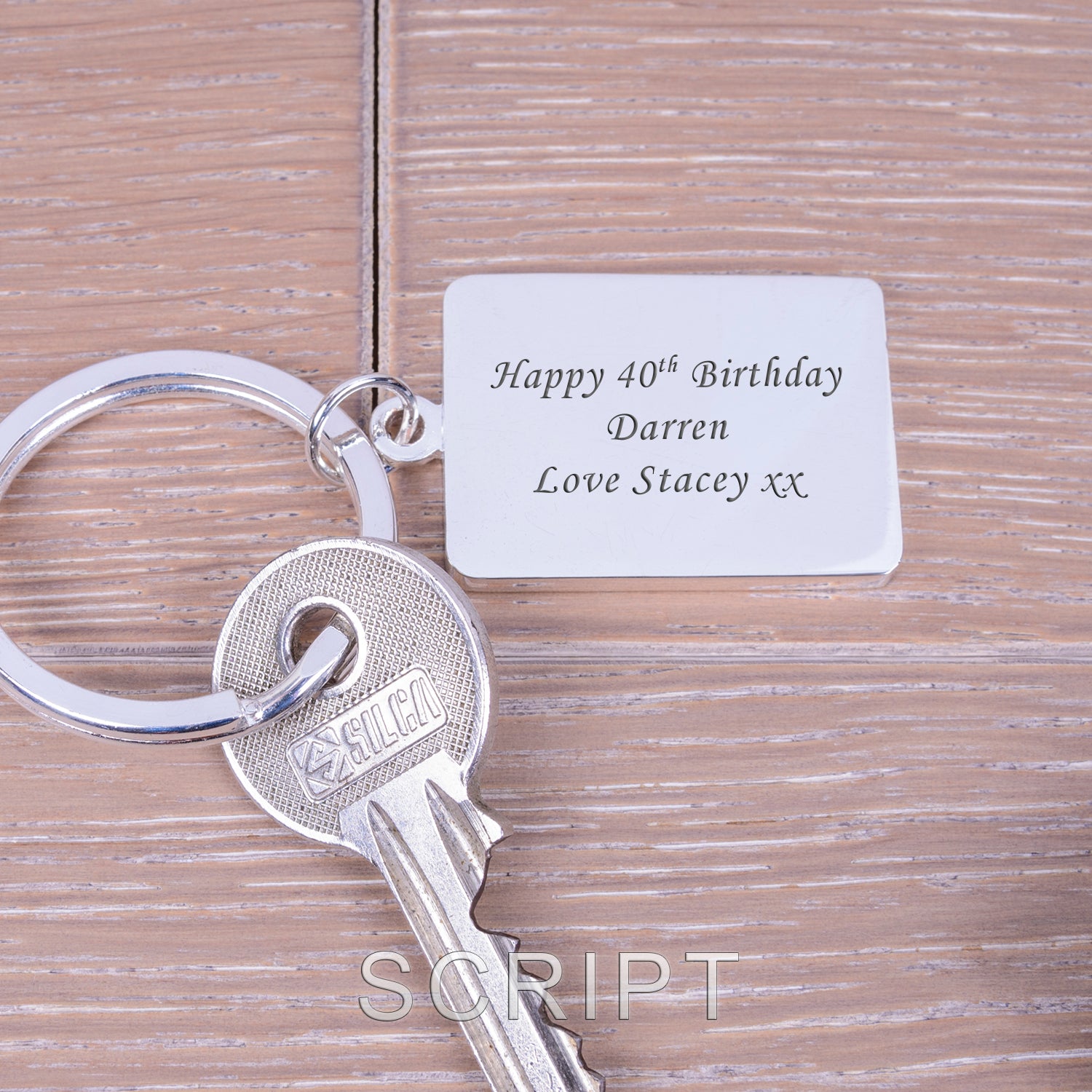 Silverplated key ring. Personalise with your own message. Choose from one of 2 font styles. Dimensions 36 x 27mm.