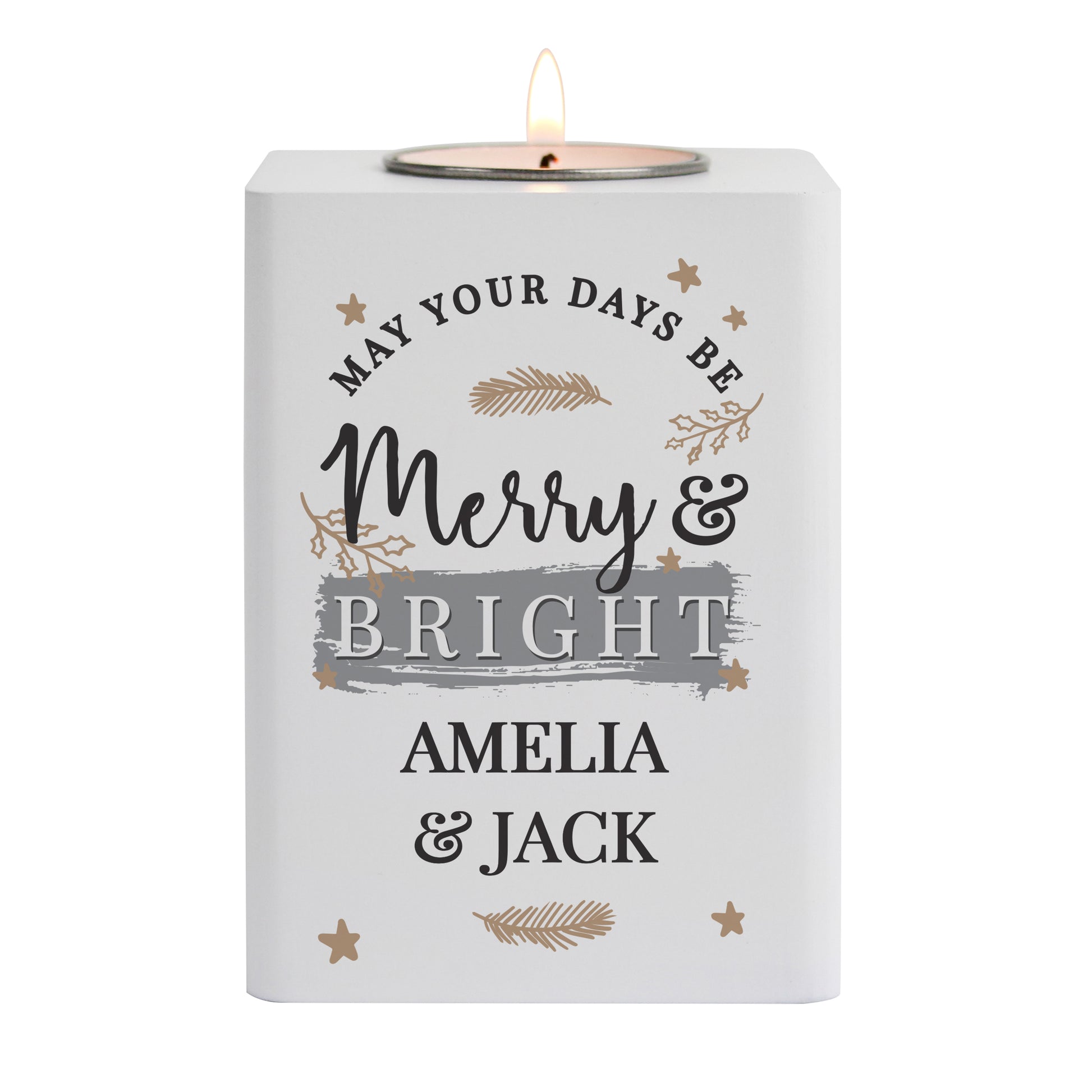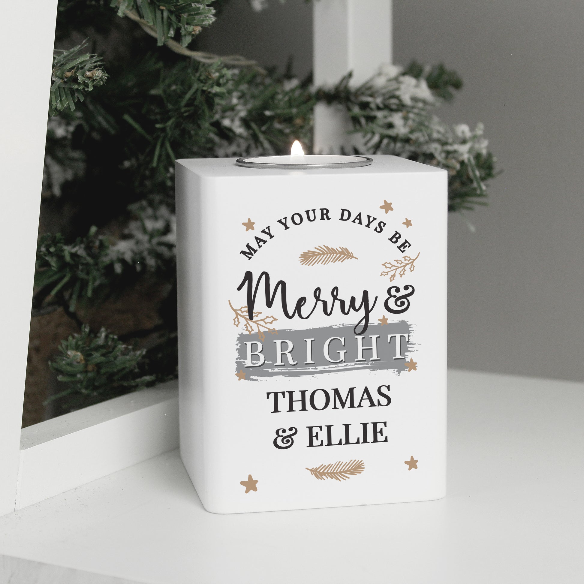 Personalised Merry & Bright White Wooden Tea light Holder