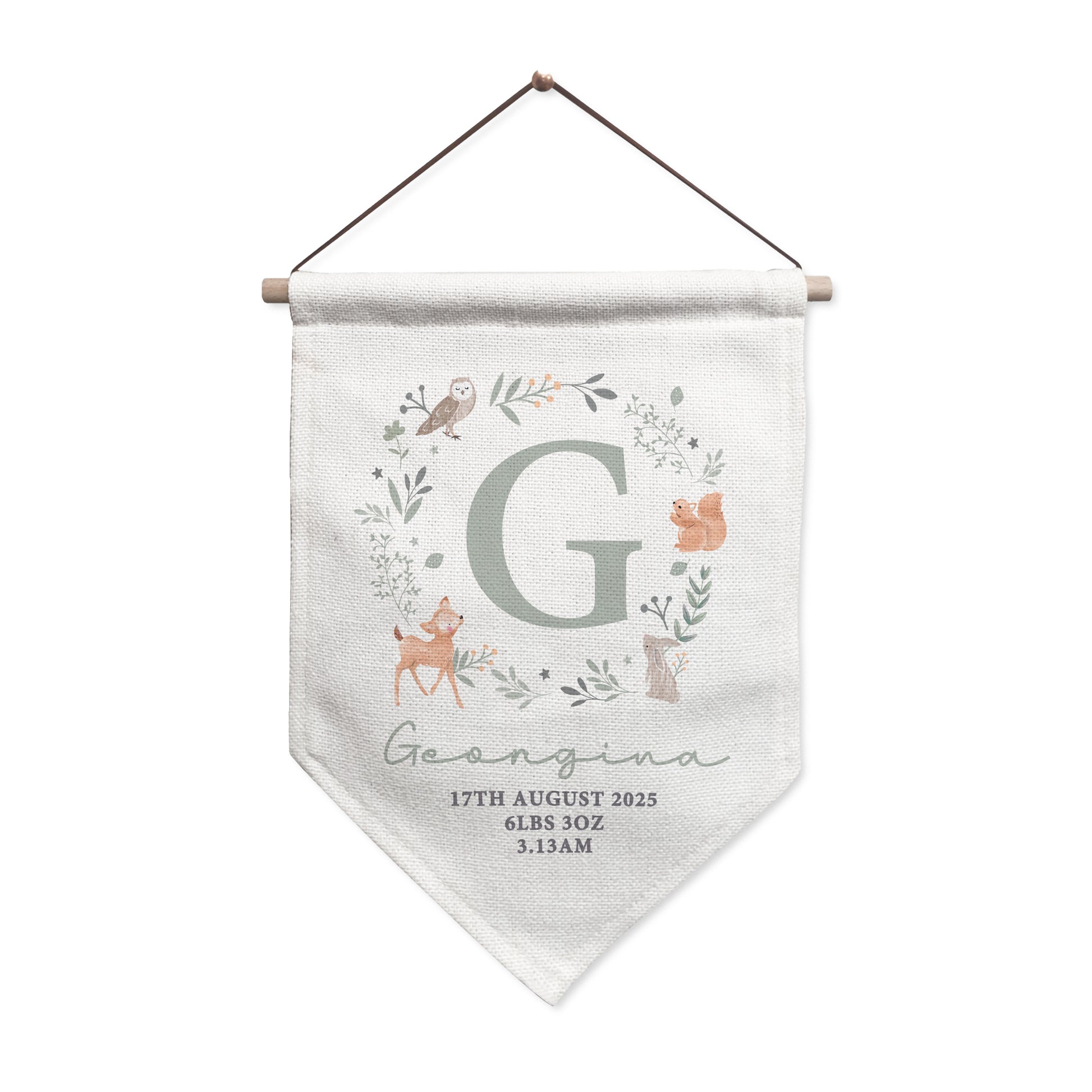 This beautifully crafted banner features an enchanting design of adorable woodland creatures and can be personalised as below