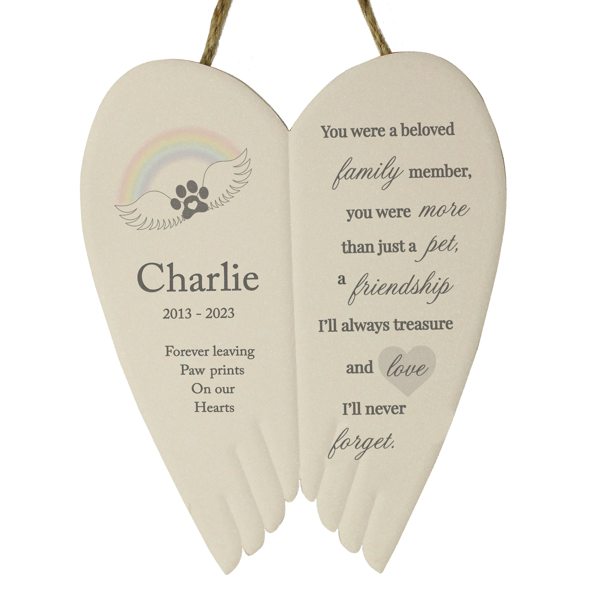 Featuring a beautiful verse on the right, these hanging ceramic wings can be personalised with a name and personal message beneath as below: