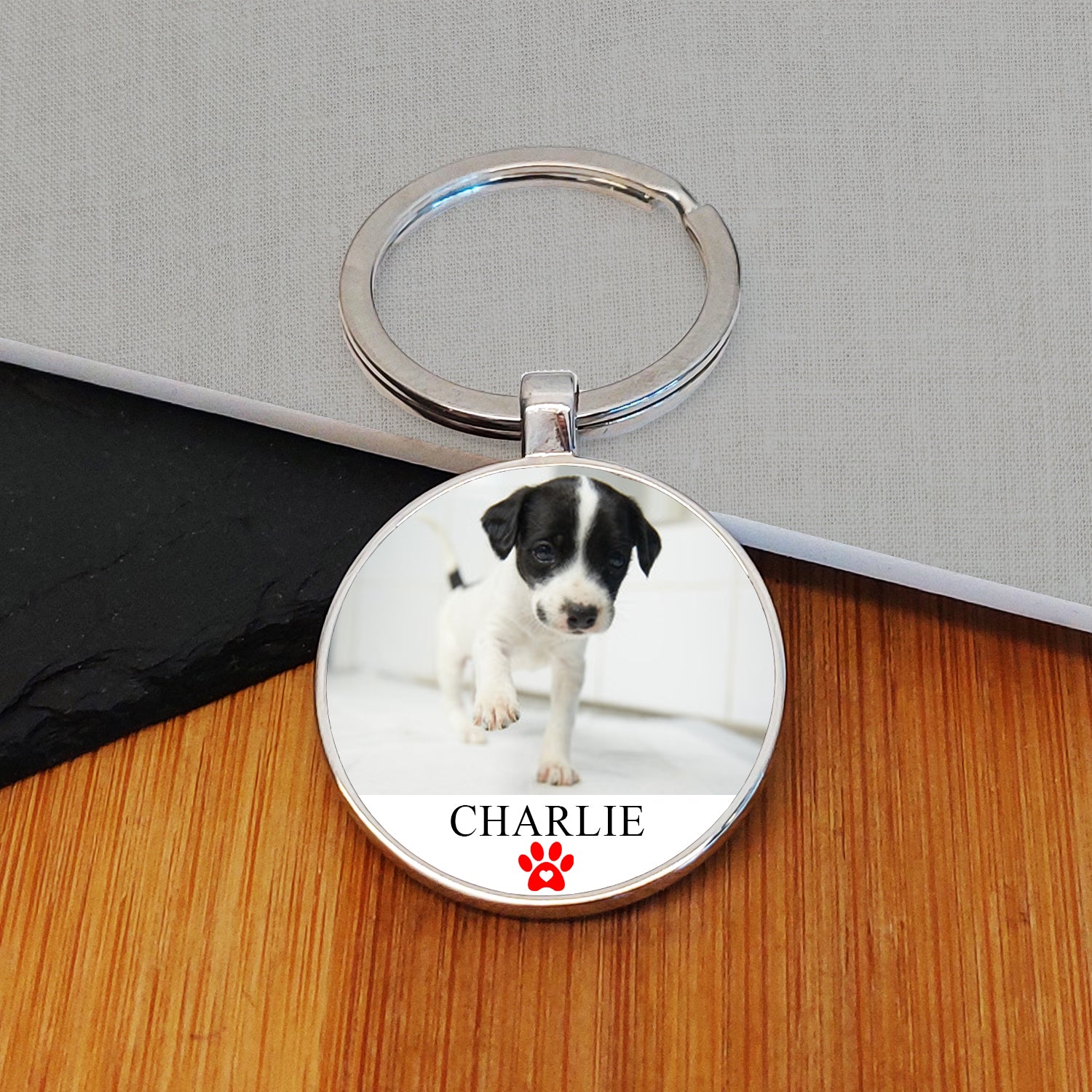 Choose a favourite pet photo to add to this beautifully made metal key ring. Then add your own text to the red paw design. The perfect gift for any pet lover. Solid metal key ring. Fob Size: 30mm. The key ring is presented in an organza drawstring bag.