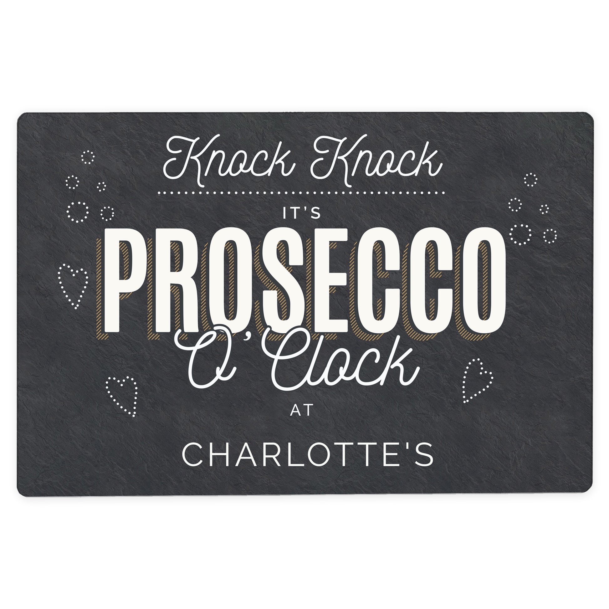 Knock knock it's prosecco o'clock at is fixed text and cannot be changed.
