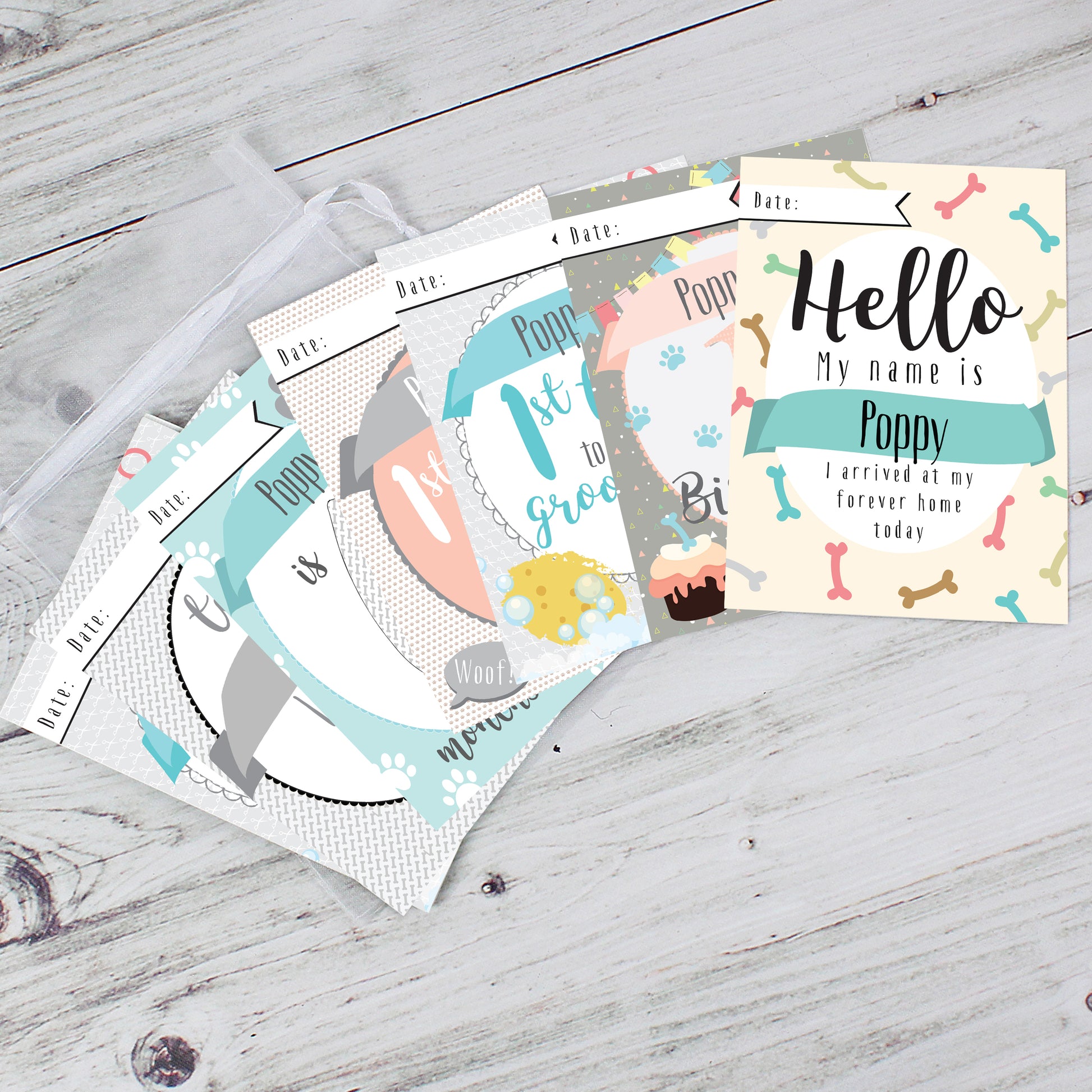 These cards are the perfect size to place next to your puppy, or if they are very well behaved, hold in their mouth.