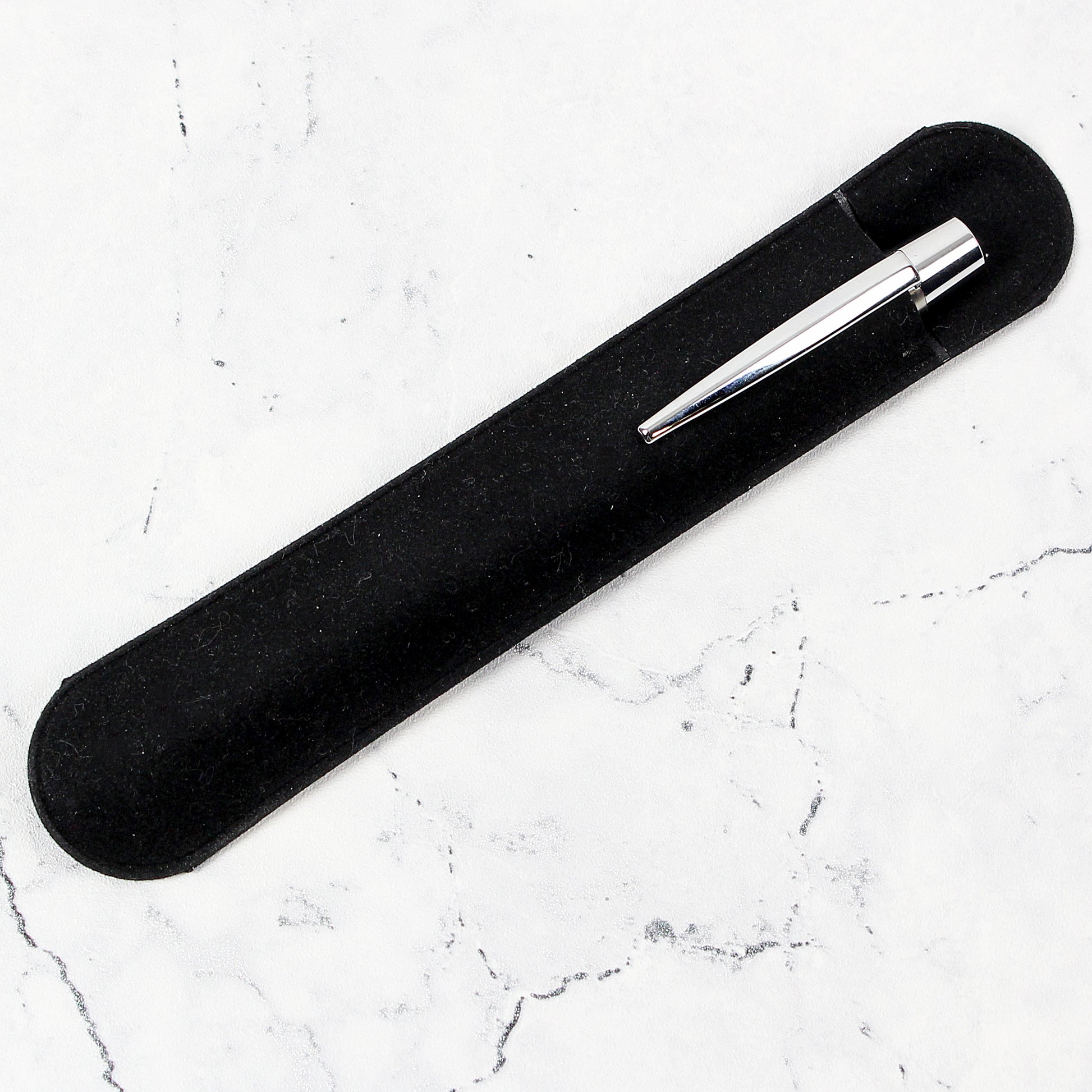 The pen is supplied with a black velvet-textured pouch.