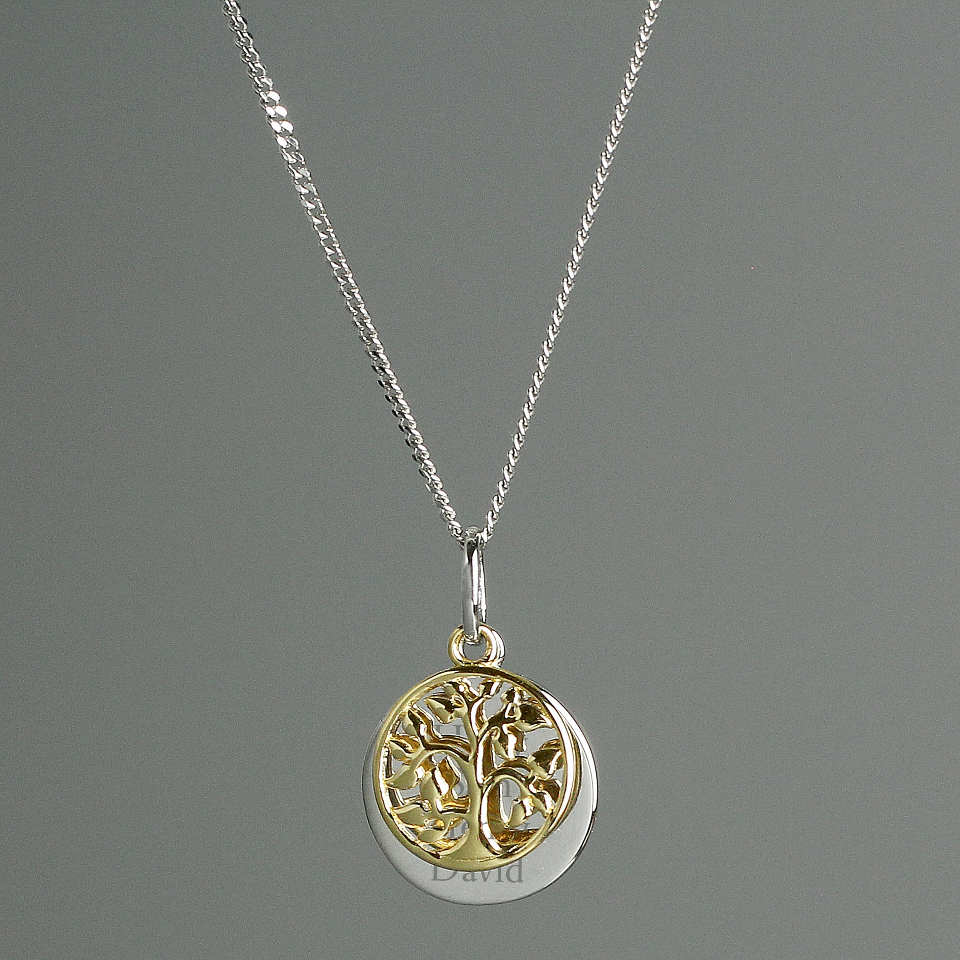 The necklace is sterling silver and features a gold plated filigree family tree cut out.