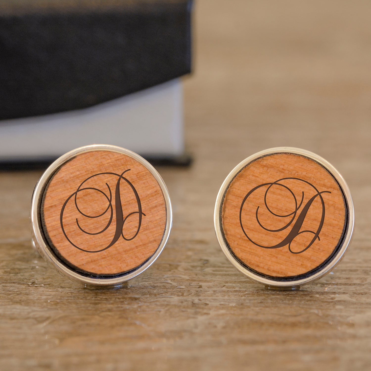 High quality silver finish round cufflinks with a cherry wood centre. Each cufflink is engraved with a script initial of your choice Supplied in a smart cufflink case.