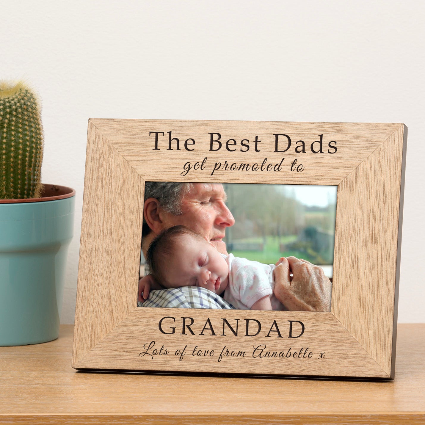 A stylish personalised oak finish photoframe. The top is engraved with "The Best Dads get promoted to", just add the name of the recipient (i.e GRANDAD) and a message to complete the design.