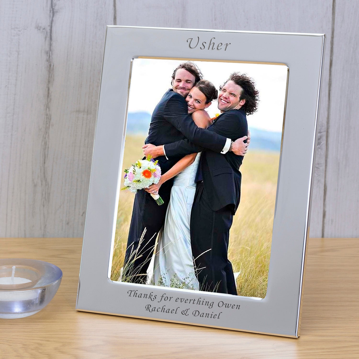 High quality silver plated frame.The top reads "Usher". The bottom is left free for your own personalised message.The frame holds a 6x4 photograph (outer dimensions are 185mm x 135mm). Available portrait or landscape.