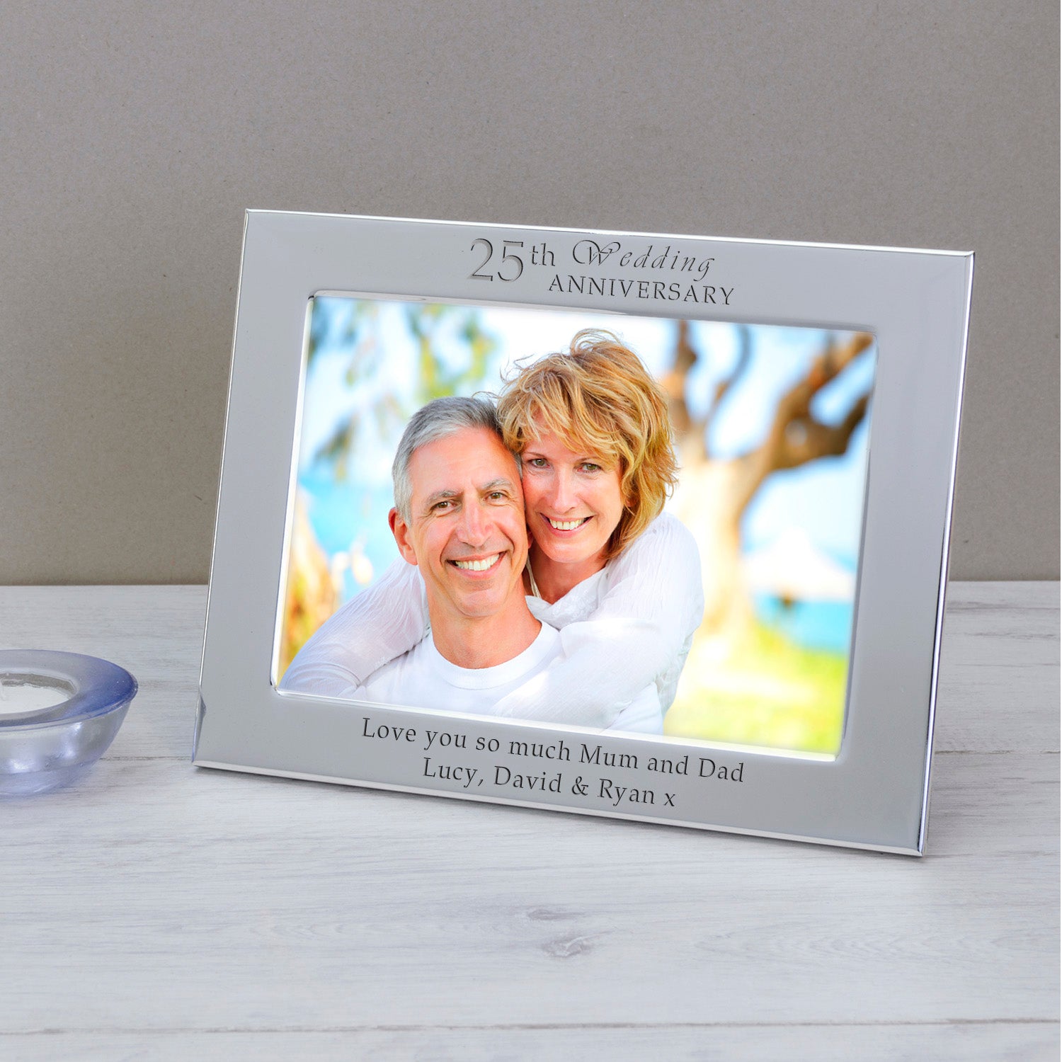 The frame holds either a 6x4 photograph (outer dimensions are 185mm x 135mm) or a 7x5 photograph (outer dimensions are 215mm x 165mm). It is available in portrait or landscape orientation, allowing you to perfectly display that meaningful moment.