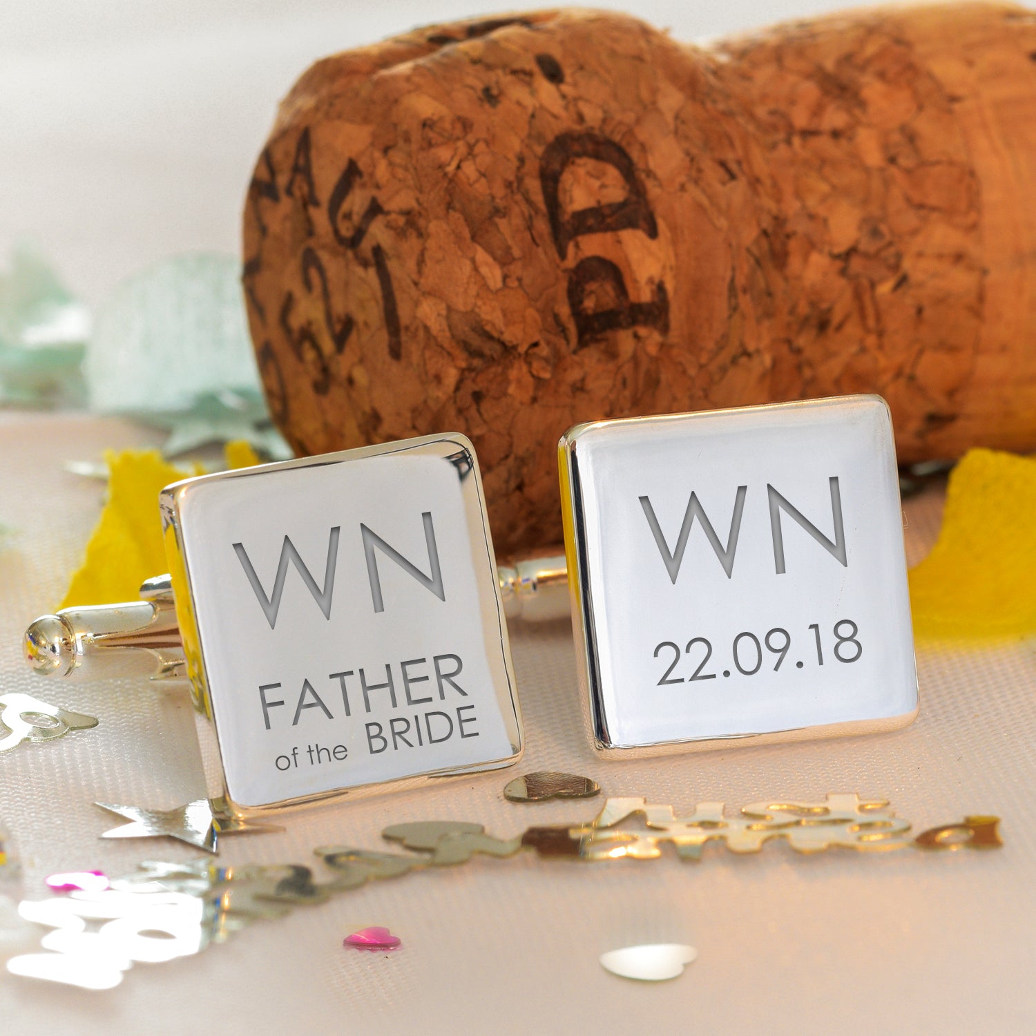 High quality silver finish square cufflinks for the entire wedding party. One cufflink is engraved with the recipient's role in the wedding party, the other is engraved with the date of wedding, both cufflinks have the recipient's initials engraved. Supplied in a smart cufflink case.