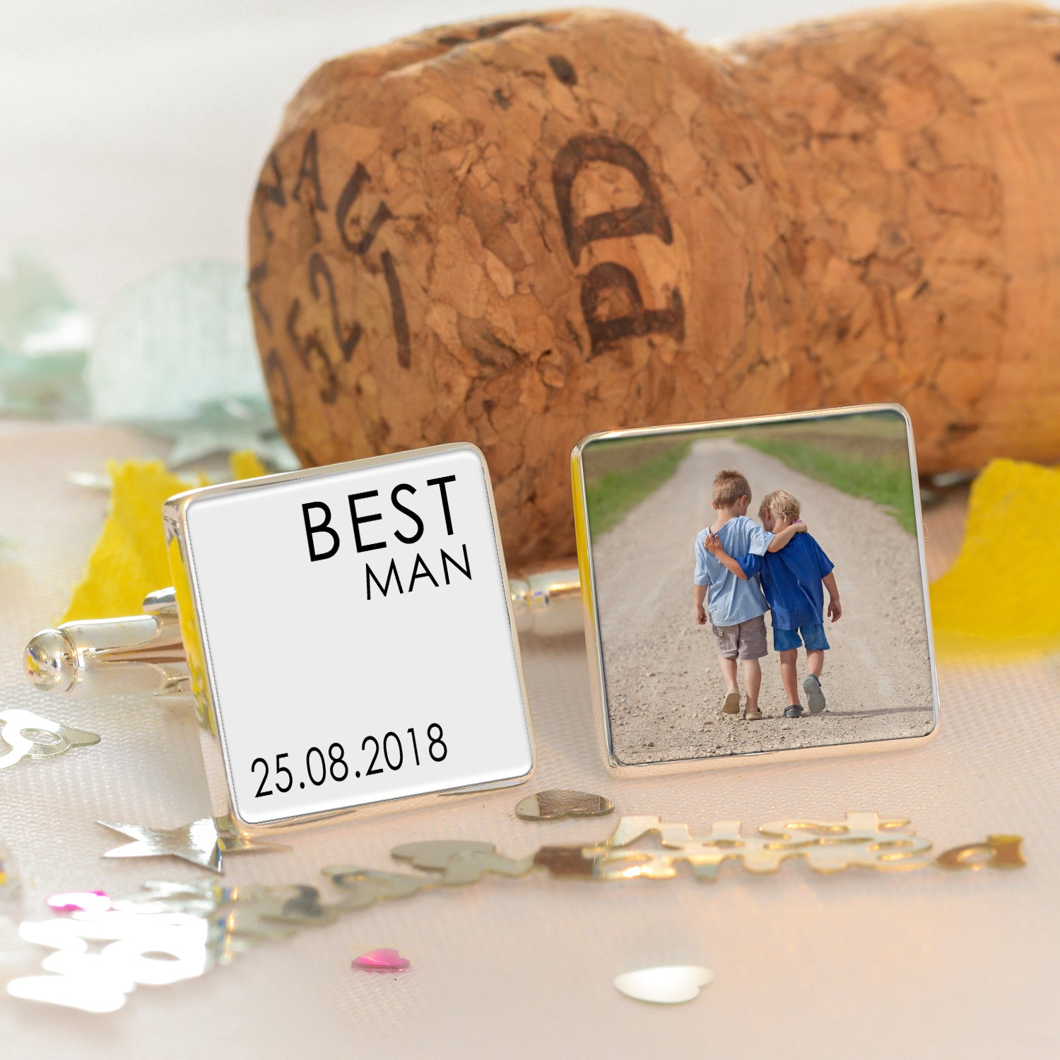 High quality square silver finish cufflinks for the entire wedding party. Choose the recipients wedding party role and add a date for the 1st cufflink. The 2nd cufflink is personalised with an image of your choice. Supplied in a smart cufflink case.